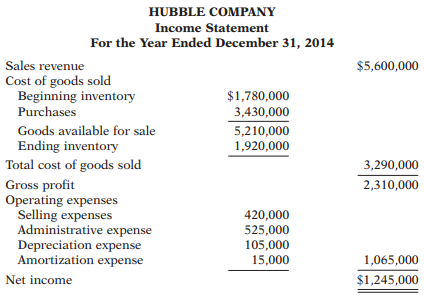 HUBBLE COMPANY Income Statement For the Year Ended December 31, 2014 Sales revenue $5,600,000 Cost of goods sold Beginning inventory $1,780,000 3,430,000 Purchases Goods available for sale 5,210,000 1,920,000 Ending inventory Total cost of goods sold 3,290,000 Gross profit Operating expenses Selling expenses Administrative expense Depreciation expense Amortization expense 2,310,000 420,000 525,000 105,000 15,000 1,065,000 Net income $1,245,000