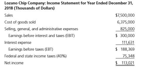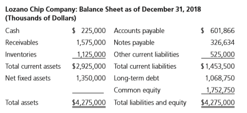 Lozano Chip Company: Balance Sheet as of December 31, 2018 (Thousands of Dollars) $ 225,000 Accounts payable $ 601,866 Cash Receivables 1,575,000 Notes payable 326,634 Inventories 1,125,000 Other current liabilities 525,000 Total current assets $2,925,000 Total current liabilities $1,453,500 Net fixed assets 1,350,000 Long-term debt 1,068,750 Common equity 1,752,750 Total assets $4,275,000 Total liabilities and equity $4,275,000 Lozano Chip Company: Income Statement for Year Ended December 31, 2018 (Thousands of Dollars) Sales $7,500,000 Cost of goods sold 6,375,000 Selling, general, and administrative expenses 825,000 Earnings before interest and taxes (EBIT) $ 300,000 Interest expense 111,631 Earnings before taxes (EBT) $ 188,369 Federal and state income taxes (40%) 75,348 Net income $ 113,021 Ratio Lozano Industry Average Current assets/Current liabilities 2.0 Days sales outstanding (365-day year) 35.0 days COGS/Inventory 6.7 Sales/Fixed assets 12.1 Sales/Total assets 3.0 Net income/Sales 1.2% Net income/Total assets 3.6% Net income/Common equity 9.0% Total debt/Total assets 30.0% Total liabilities/Total assets 60.0%