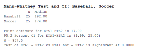 Data were collected on the weights of 25 male baseball players and 25 male soccer players. Assume that these are random samples from all college baseball and soccer players. Refer to the Mann-Whitney output. Assume the shapes and spreads of the two distributions are the same.