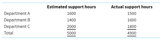 Department A Department B Department C Total Estimated support hours 1600 1400 2000 5000 Actual support hours 1500 1600 1800 4900