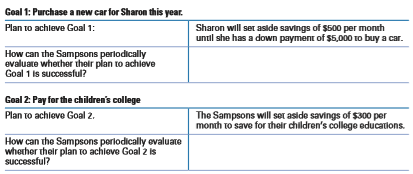 Goal 1: Purchase a new car for Sharon this year. Plan to achleve Goal 1: Sharon will ser aside savings of $500 per month untl she has a down payment of $5,000 to buy a car. How can the Sampsons perlodically evaluate whether their plan to achleve Goal 1 Is successful? Goal 2: Pay for the children's college The Sampsons will set aside savings of $300 per month to save for their children's college educations. Plan to achieve Goal 2. How can the Sampsons periodically evaluate whether their plan to achieve Goal 2 is successful?