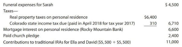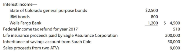 For several years, the Coles' household has included David's divorced mother, Sarah, who has been claimed as their dependent. In late December 2017, Sarah unexpectedly died of coronary arrest in her sleep. Unknown to Ella and David, Sarah had a life insurance policy and a savings account (with David as the designated beneficiary of each). In 2017, the Coles purchased two ATVs for $14,000. After several near mishaps, they decided that the sport was too dangerous. In 2018, they sold the ATVs to their neighbor.