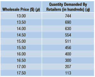 Quantity Demanded By Wholesale Price ($) (P) Retailers (in hundreds) (q) 13.00 744 13.50 690 14.00 630 14.50 554 15.00 511 15.50 456 16.00 400 16.50 300 17.00 207 17.50 113