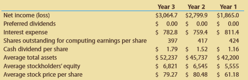 Year 3 Year 2 Year 1 Net income (loss) $3,064.7 $2,799.9 0.00 $ 0.00 $ 782.8 $ 759.4 $1,865.0 Preferred dividends $ 0.00 $ 811.4 Interest expense Shares outstanding for computing earnings per share Cash dividend per share Average total assets Average stockholders' equity Average stock price per share 397 417 424 2$ 1.79 $4 1.52 1.16 $ 52,237 $ 45,737 $ 6,821 $ 6,545 $ 79.27 $ 42,200 $ 5,555 $ 61.18 $ 80.48