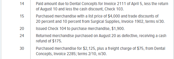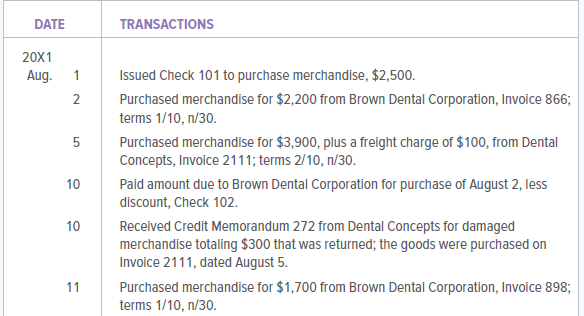 Dental Supplies, Inc., is a wholesale supplier of dental supplies and materials that commenced business on August 1, 20X1. The company purchases merchandise for cash and on open account. In August 20X1, Dental Supplies, Inc., engaged in the following purchasing and cash payment activities: