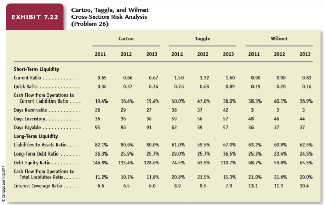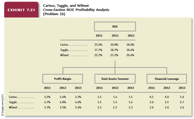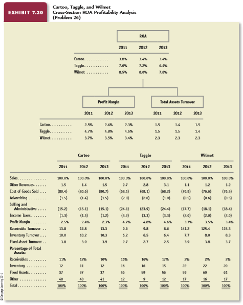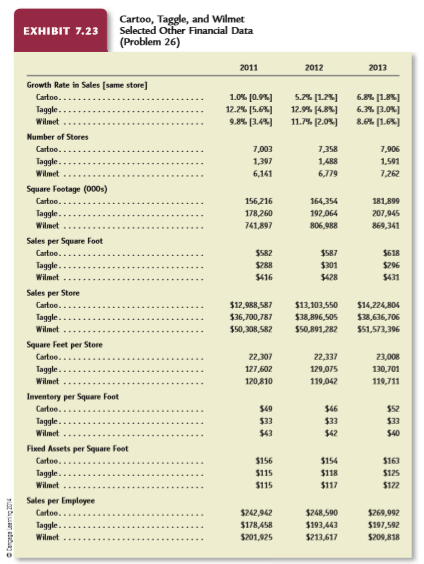 Cartoo, Taggle, and Wilmet Cross-Section ROA Profitability Analysis (Problem 26) EXHIBIT 7.20 ROA 2011 2012 2013 Cartoo. 3.8% 3.4% 34% Taggle. Wilnet 7.0% 7.2% 8.5% 8.0% 7.8% Profit Margin Total Assets Turnover 2011 2012 2013 2011 2012 2013 Cartoo... 2.5% 2.4% 2.3% 1.5 1.4 1.5 Taggle. . 4.7% 4.8% 4.6% 1.5 1.5 14 Wilnet 3.7% 3.5% 3.4% 2.3 2.3 2.3 Cartoe Taggle Wilmet 2011 2012 2013 2011 2012 2013 2011 2012 2013 Sales.... 100.0% 100.0% 100.0% 100.0% 100.0% 100.0% 100.0% 100.0% 100.0% Other Revenues. . 1.5 1.4 1.5 2.7 2.8 3.1 1.1 1.2 1.2 Cost of Goods Sold (80.4) (80.6) (80.7) (68. 1) (sa. 1) (68.2) (76.9) (76.6) (76.5) Advertising (1.5) (14) (1.5) (2.0) (2.0) (19) (0.5) (0.6) (0.5) Selling and Administrative. (15.2) (15.1) (15.1) (24.1) (23.9) (24.4) (17.7) (18.1) (18.4) Income Tawes. (1.3) (1.3) (1.2) (3.2) (3.3) (3.3) (2.0) (2.0) (2.0) Profit Margin .= 2.5% 2.4% 2.3% 4.7% 4.3% 4.6% 3.7% 3.5% 3.4% Roceivable Turmover 13.8 12.8 13.3 9.6 9.8 8.6 1412 125.4 115.3 Inventory Tumover . .. Fixed Asset Tumover.. Percentage of Total 10.0 10.2 10.3 6.2 6.5 6.4 7.7 8.0 8.3 3.8 3.9 3.9 2.7 2.7 2.5 3.9 3.8 3.7 Assets: Receivables.. 11% 12% 10% 16% 10% 17% 2% 2% Inventory Fixed Assets. 12 11 12 16 16 15 22 22 20 37 37 37 56 59 56 59 60 61 Other 40 40 41 12 12 17 16 17 Total. 100 100% 100% 100% 100% 100% 100% 100% 100% Cartoo, Taggle, and Wilmet Cross-Section ROE Profitability Analysis (Problem 26) EXHIBIT 7.21 ROE 2011 2012 2013 Cartoo.. 23.6% 20.8% 18.6% Taggle. 17.7% 18.7% 18.4% Wilmet 22.2% 21.2% 20.4% Profit Margin Total Assets Turnover Financial Leverage 2011 2012 2013 2011 2012 2013 2011 2012 2013 Cartoo.. 2.5% 2.4% 2.3% 1.5 1.4 1.5 6.5 6.0 5.6 Taggle. 4.7% 4.8% 4.6% 1.5 1.5 1.4 2.6 2.5 2.7 Wilmet 3.7% 3.5% 3.4% 2.3 2.3 2.3 2.6 2.6 2.6 O Dargaga Laaming 2014 Cartoo, Taggle, and Wilmet Cross-Section Risk Analysis (Problem 26) EXHIBIT 7.22 Cartoo Taggle wilmet 2011 2012 2013 2011 2012 2013 2011 2012 2013 Short-Term Liquidity Current Ratio .. 0.65 0.66 0.67 1.50 1.32 1.60 0.90 0.90 0.81 Quick Ratio 0.36 0.37 0.36 0.76 0.63 0.89 0.19 0.20 0.16 Cash Flow from Operations to Current Liabilities Ratio.... Days Receivable .. 19.4% 16.4% 19.4% 50.0% 47.0% 36.0% 38.3% 40.1% 36.9% 26 29 27 38 37 42 3 3 3 Days Inventory. 36 36 36 59 56 57 48 46 44 Days Payable ... 95 96 91 62 59 57 36 37 37 Long-Term Liquidity Liabilities to Assets Ratio..... 82.1% 80.6% 80.0% 61.0% 59.5% 67.0% 63.2% 60.8% 62.5% Long-Term Debt Ratio 26.3% 25.9% 25.7% 29.0% 25.7% 36.5% 25.3% 23.4% 24.5% Debt-Equity Ratio . 146.8% 133.4% 128.6% 74.5% 63.5% 110.7% 68.7% 59.8% 65.5% Cash Flow from Operations to Total Liabilities Ratio...... 11.2% 10.1% 11.8% 20.8% 21.5% 15.3% 21.0% 21.6% 20.0% Interest Coverage Ratio...... 6.6 6.5 6.0 8.9 8.5 7.9 13.1 11.3 10.4 O Cangaga Learning 2014 Cartoo, Taggle, and Wilmet Selected Other Financial Data (Problem 26) EXHIBIT 7.23 2011 2012 2013 Growth Rate in Sales [same store] Cartoe.. 1.0% (0.9%) 12.2% (5.0%) 9.8% (3.4%) 5.2% (1.2%) 12.9%. [4.8%] 11.7% (2.0%) 6.8% (18%] 6.3% (3.0%] 8.0% (1.6%] Taggle.. Wilmet Number of Stores Cartoe. 7,003 7,358 7,906 Taggle.. Wilmet 1,397 1,488 1,591 6,141 6,779 7,262 Square Footage (000s) Cartoo. 156,216 164,354 181,899 Taggle. 178,260 192,064 207,945 Wilmet 741,897 806,988 869,341 Sales per Square Foot $587 $301 $428 Cartoo.. SS82 $618 Taggle.. $288 $206 Wilmet $416 $431 Sales per Store $12,988,587 $36,700,787 $13,103,550 $38,896,505 $14,224,804 $38,636,706 Cartoe. Taggle. Wilmet $50,308,582 $50,891,282 $51,573,396 Square Feet per Store Cartoe. 22,307 22,337 23,008 130,701 Taggle. Wilmet 127,602 129,075 120,810 119,042 119,711 Inventory per Square Foot Cartoe.. $49 $46 $33 $42 $52 Taggle. $33 $43 $33 $40 Wilmet Fixed Assets per Square Foot Cartoe. $156 $154 $163 $115 $118 $125 $122 Taggle.. $117 Wilmet $115 Sales per Employee Cartoe.. $242,942 $248,590 $269,992 $178,458 $201,925 $193,443 $213,617 $197,592 $209,818 Taggle.. Wilmet