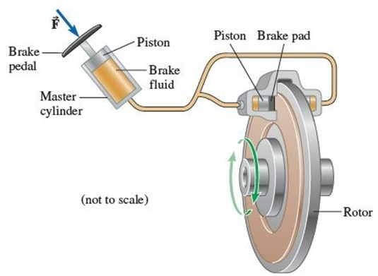 Depressing the brake pedal in a car pushes on a piston with cross- sectional area 3.0 cm2. The piston applies pressure to the brake fluid, which is connected to two pistons, each with area 12.0 cm2. Each of these pistons presses a brake pad against one side of a rotor attached to one of the rotating wheels. See the figure for this problem.
