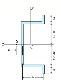 > Derive the following formula for the distance e from the centerline of the wall to the shear center S for the C-section of constant thickness shown in the figure: Also, check the formula for the special cases of a channel section (a = 0) and a slit recta