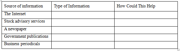 Source of information Type of Information How Could This Help The Internet Stock advisory services A newspaper Government publications Business periodicals