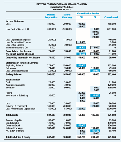 Debit Credit $ 92,000 135,000 140,000 75,000 400,000 30,000 Cash Accounts Receivable Inventory Land Buildings & Equipment Patents Accumulated Depreciation Accounts Payable Bonds Payable Noncontrolling Interest Common Stock Retained Earnings $210,000 114,200 90,000 84,800 100,000 273,000 $872,000 Totals $872,000 DETECTO CORPORATION AND STRAND COMPANY Consoldation Worksheet December 31, 20X3 Consolidation Entries Detecto Strand Corporation Сompany DR CR Consolidated Income Statement Sales 400,000 200,000 90,000 22,000 488,000 8,000 81,000 4,000 20,000 Less: Cost of Goods Sold 280,000) (120,000) (287,000) (15,000) Less: Depreciation Expense Less: Amortization Expense Less: Other Expense Income from Strand Co. (25,000) (40,000) (5,000) (65,000) 5,000 (35,000) 19,400 (30,000) 22,400 3,000 139,400 13,600 116,000 2,000 Consolidated Net Income 79,400 35,000 91,000 NCI in Net Income of Strand Controlling Interest in Net Income (11,600) 79,400 35,000 153,000 118,000 79,400 Statement of Retained Earnings Beginning Balance Net Income 273,000 79,400 (50,000) 150,000 35,000 (20,000) 150,000 153,000 273,000 79,400 (50,000) 118,000 20,000 Less: Dividends Declared Ending Balance 302,400 165,000 303,000 138,000 302,400 Balance Sheet Cash Accounts Receivable Inventory 26,800 80,000 120,000 35,000 40,000 90,000 61,800 120,000 199,000 9,000 2,000 Patent 25,000 6,000 4,800 4,000 25,000 Investment in Subsidiary 130,600 130,400 15,000 Land Buildings & Equipment Less: Accumulated Depreciation 70,000 340,000 (165,000) 20,000 200,000 (85,000) 10,000 20,000 80,000 520,000 (230,000) 20,000 Total Assets 602,400 300,000 59,800 186,400 775,800 Accounts Payable Bonds Payable Common Stock Retained Earnings NCI in NA of Strand 80,000 120,000 100,000 302,400 15,000 70,000 50,000 165,000 50,000 303,000 4,000 3,200 95,000 190,000 100,000 302,400 88,400 138,000 85,600 10,000 Total Liabilities & Equity 602,400 300,000 360,200 233,600 775,800
