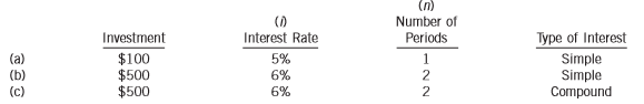 (n) () Interest Rate Number of Type of Interest Simple Simple Compound Investment Periods (a) (b) (c) $100 $500 $500 5% 6% 6% 122