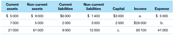 Current Non-current Current Non-current assets assets liabilities liabilities Capital Income Expense $ 5000 $ 900 $6 000 $ 1400 $3 00 $ 5000 a. 7 000 5000 2 000 3 000 2000 $26 000 b. 21 000 61 000 9000 12 000 C. 60 100 41 000