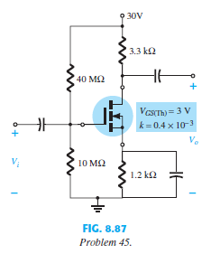 > Determine Vo for the network of Fig. 8.86 if Vi = 4 mV, V GS (Th) = 4 V, and ID (on) = 4 mA, with VGS (on) = 7 V and gos = 20 mS.