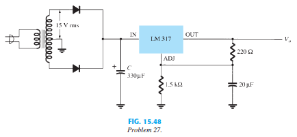 > An RC filter stage (R = Ω, C = mF) is used to filter a signal of V dc with V rms operating from a full-wave rectifier. Calculate the percentage ripple at the output of the RC section for a-mA load. Also calculate the ripple of the filtere