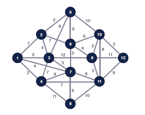 Determine the shortest route from node 1 (origin) to node 12 (destination) for the following net- work. Distances are given along the network branches: