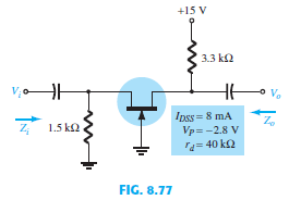 > Determine Zi, Zo, and Av for the network of Fig. 8.75 if IDSS = 6 mA, VP = - 6 V, and gos = 40 mS.