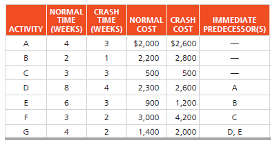 NORMAL CRASH TIME ACTIVITY (WEEKS) (WEEKS) TIME NORMAL CRASH IMMEDIATE COST COST PREDECESSOR(S) A 4 3 $2,000 $2,600 В 2 2,200 2,800 3 3 500 500 D 8 4 2,300 2,600 A E 6 3 900 1,200 B F 3 2 3,000 4,200 4 2 1,400 2,000 D, E