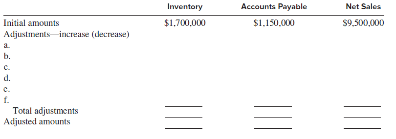 Inventory Accounts Payable Net Sales Initial amounts $1,700,000 $1,150,000 $9,500,000 Adjustments-increase (decrease) а. b. с. d. е. f. Total adjustments Adjusted amounts