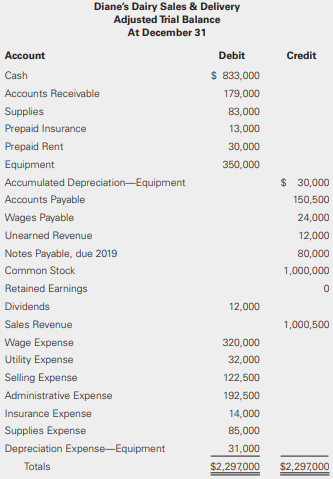 Dianeâs Dairy Sales & Delivery finished its first year of operations on December 31, 2018. After adjusting journal entries, the company presented the following adjusted trial balance.
