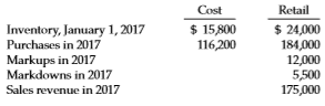Cost Retail $ 15,800 116,200 $ 24,000 184,000 12,000 5,500 175,000 Inventory, January 1, 2017 Purchases in 2017 Markups in 2017 Markdowns in 2017 Sales revenue in 2017