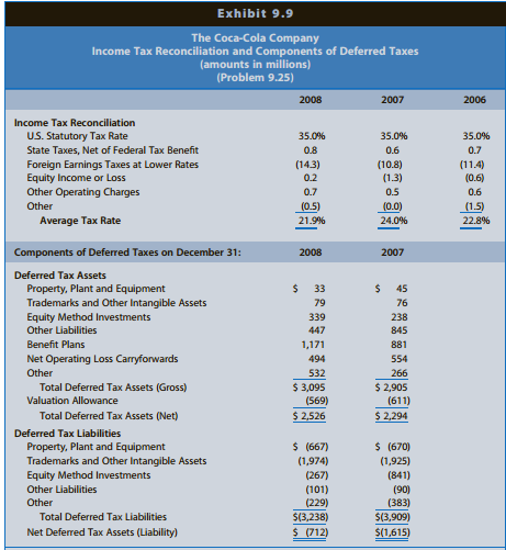 Exhibit 9.9 The Coca-Cola Company Income Tax Reconciliation and Components of Deferred Taxes (amounts in millions) (Problem 9.25) 2008 2007 2006 Income Tax Reconciliation US. Statutory Tax Rate 35.0% 35.0% 35.0% State Taxes, Net of Federal Tax Benefit 0.8 0.6 0.7 Foreign Earnings Taxes at Lower Rates Equity Income or Loss Other Operating Charges Other (143) (10.8) (1.3) (11.4) 0.2 (0.6) 0.7 0.5 0.6 (0.5) (0.0) (1.5) 22.8% Average Tax Rate 21.9% 24.0% Components of Deferred Taxes on December 31: 2008 2007 Deferred Tax Assets Property, Plant and Equipment Trademarks and Other Intangible Assets Equity Method Investments Other Liabilities Benefit Plans 33 45 79 76 339 238 447 845 1,171 881 Net Operating Loss Carryforwards Other 494 554 532 266 $ 3,095 (569) $ 2,905 (611) Total Deferred Tax Assets (Gross) Valuation Allowance Total Deferred Tax Assets (Net) $ 2,526 $ 2,294 Deferred Tax Liabilities Property, Plant and Equipment Trademarks and Other Intangible Assets Equity Method Investments $ (670) $ (667) (1,974) (1,925) (267) (841) Other Liabilities (101) (90) (383) Other (229) Total Deferred Tax Liabilities $(3,238) $(3,909) Net Deferred Tax Assets (Liability) $ (712) $(1,615)