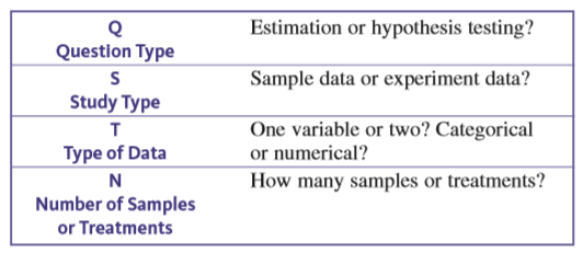 > Consider the four key questions that guide the choice of an inference method. Two of these questions are T: Type of data. One variable or two? Categorical or numerical? N: Number of samples or treatments. How many samples or treatments? What are the