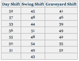 Do workers on different shifts get different amounts of sleep per week? Some people believe that shift workers who regularly work the graveyard shift (12:00 a.m. to 8:00 a.m.) or swing shift (4:00 p.m. to 12:00 a.m.) are unable to get the same amount of sleep as day workers because of family schedules, noise, amount of daylight, and other factors. To test this theory, a business analyst samples workers from day, swing, and graveyard shifts and asks each worker to keep a sleep journal for one week. The following data represent the number of hours of sleep per week per worker for the different shifts. Use the Kruskal-Wallis test to determine whether there is a significant difference in the number of hours of sleep per week for workers on these shifts. Use ( = .05.