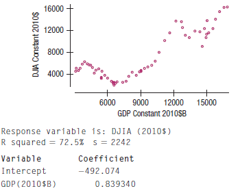Does the Dow Jones Industrial Average (DJIA) reflect the economy as measured by the Gross Domestic Product (GDP)? Hereâs a plot and a regression. (Both are converted to 2010 dollars to remove the effects of inflation. GDP is in $B to make the numbers manageable.)