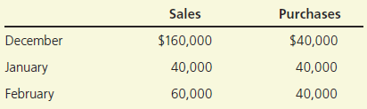 Sales Purchases December $160,000 $40,000 January 40,000 40,000 February 60,000 40,000