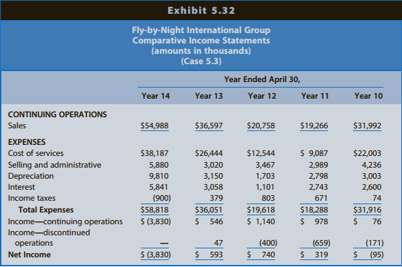 Exhibit 5.32 Fly-by-Night International Group Comparative Income Statements (amounts in thousands) (Case 5.3) Year Ended April 30, Year 14 Year 13 Year 12 Year 11 Year 10 CONTINUING OPERATIONS Sales $54,988 $36,597 $20,758 $19,266 $31,992 EXPENSES Cost of services $38,187 $26,444 $12,544 $ 9,087 $22,003 Selling and administrative Depreciation 5,880 3,020 3,150 3,467 2,989 4,236 2,798 9,810 5,841 1,703 3,003 Interest 3,058 1,101 2,743 2,600 Income taxes (900) 379 803 671 74 Total Expenses Income-continuing operations $58,818 $ (3,830) $36,051 $19,618 $18,288 $31,916 546 $ 1,140 978 $ 76 Income-discontinued operations 47 (400) (659) (171) Net Income $ (3,830) 593 740 %24 319 (95)