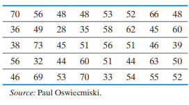Dr. Paul Oswiecmiski randomly selects 40 of his 20- to 29-year-old patients and obtains the following data regarding their serum HDL cholesterol: