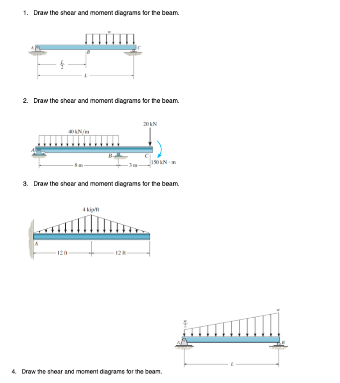 1. Draw the shear and moment diagrams for the beam. 2. Draw the shear and moment diagrams for the beam. 20 kN 40 kN/m 150 kN - m 3. Draw the shear and moment diagrams for the beam. 4 kip/ſt 12 ft 12 ft- 4. Draw the shear and moment diagrams for the beam.
