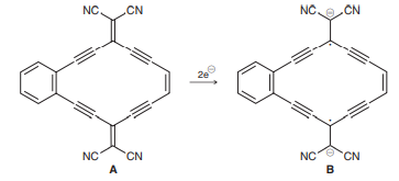 Due to their potential application in organic electronic devices, such as television screens, a large number of compounds containing quinoidal pi systems (such as compound A) have been prepared. Reduction of A gives B, as shown: