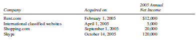 During 2005, eBay acquired 100% of four different companies as follows (assume all companies have a December 31 year-end). Net income amounts are stated in thousands of dollars; assume that the net income is earned uniformly throughout the year 2005.