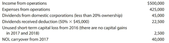 $500,000 Income from operations Expenses from operations Dividends from domestic corporations (less than 20% ownership) Dividends received deduction (50% × $45,000) 425,000 45,000 22,500 Unused short-term capital loss from 2016 (there are no capital gains in 2017 and 2018) 2,500 NOL carryover from 2017 40,000