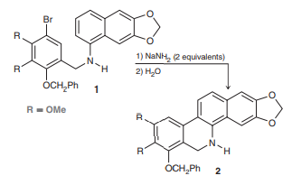 During a synthesis of a potential anticancer agent, 7-hydroxynitidine, the investigators treated bromide 1 with two equivalents of a strong base to form compound 2. Propose a plausible mechanism to account for the following ring-forming transformation: