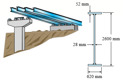> Each girder of the lift bridge (see figure) is 180 ft long and simply supported at the ends. The design load for each girder is a uniform load of intensity 1.6 kips/ft. The girders are fabricated by welding three steel plates to form an I-shaped cross se