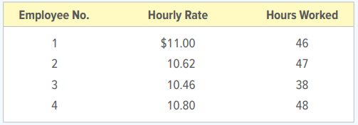 During one week, four production employees of Morgan Manufacturing Company worked the hours shown below. All these employees receive overtime pay at one and one-half times their regular hourly rate for any hours worked beyond 40 in a week. Determine the regular earnings, overtime earnings, and gross earnings for each employee.