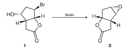 During recent studies to determine the absolute stereochemistry of a bromohydrin, the investigators observed an unexpected skeletal rearrangement. Provide a plausible mechanism for the formation of epoxide 2 from bromohydrin 1.