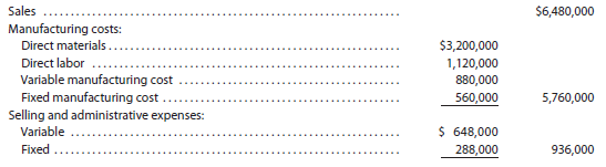Sales $6,480,000 Manufacturing costs: Direct materials. $3,200,000 Direct labor 1,120,000 880,000 Variable manufacturing cost Fixed manufacturing cost Selling and administrative expenses: Variable 560,000 5,760,000 $ 648,000 Fixed 288,000 936,000