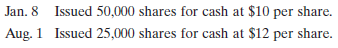 Jan. 8 Issued 50,000 shares for cash at $10 per share. Aug. 1 Issued 25,000 shares for cash at $12 per share.