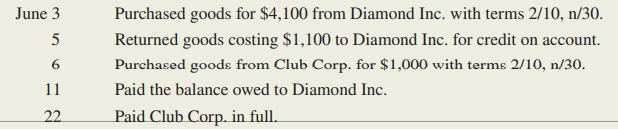 During the month of June, Ace Incorporated purchased goods from two suppliers. The sequence of events was as follows: