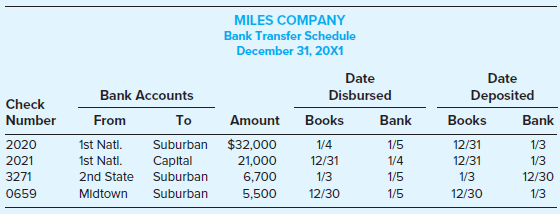 MILES COMPANY Bank Transfer Schedule December 31, 20X1 Date Date Bank Accounts Disbursed Deposited Check Number From To Amount Books Bank Books Bank $32,000 21,000 2020 1st Natl. Suburban 1/4 1/5 12/31 1/3 2021 1st Nati. Capltal 12/31 1/4 12/31 1/3 3271 2nd State Suburban 12/30 6,700 5,500 1/3 1/5 1/3 0659 Midtown Suburban 12/30 1/5 12/30 1/3