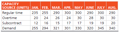 САРАСTY SOURCE (UNITS) JAN. FEB. MAR. APR. MAY JUNE JULY AUG. Regular time 235 255 290 300 300 290 300 290 Overtime 20 24 26 24 30 28 30 30 Subcontract 12 16 15 17 17 19 19 20 Demand 255 294 321 301 330 320 345 340
