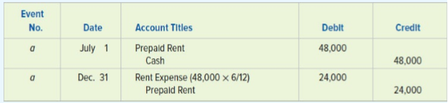 Event No. Date Account TItles Deblt Credit July 1 Prepald Rent 48,000 Cash 48,000 Rent Expense (48,000 × 6/12) Prepald Rent Dec. 31 24,000 24,000