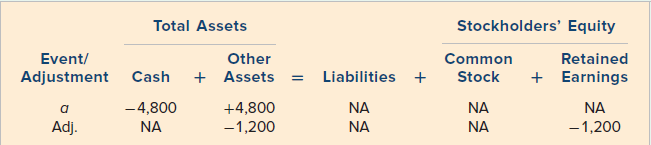 Each of the following independent events requires an end-of-period adjustment. Show how each event and its related adjustment affect the accounting equation. Assume the fiscal year ends December 31. The first event is shown as an example.