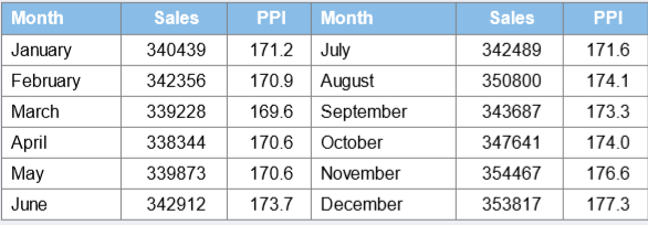 Month Sales PPI Month Sales PPI January 340439 171.2 July 342489 171.6 February 342356 170.9 August 350800 174.1 March 339228 169.6 September 343687 173.3 April 338344 170.6 October 347641 174.0 May 339873 170.6 November 354467 176.6 June 342912 173.7 December 353817 177.3