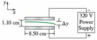 Electrons in a cathode ray tube start from rest and are accelerated through a potential difference of 12.0 kV. They are moving in the +x- direction when they enter the space between the plates of a parallel plate capacitor. There is a potential difference of 320 V between the plates. The plates have length 8.50 cm and are separated by 1.10 cm. The electron beam is deflected in the negative y-direction by the electric field between the plates.