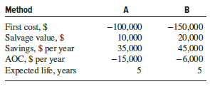 Elias wants to perform an after-tax evaluation of equivalent methods to electrostatically remove airborne particulate matter from clean rooms used to package liquid pharmaceutical products. Using the information shown, MACRS depreciation with n = 3 years, a 5-year study period, after-tax MARR = 7% per year, and Te = 34% and a spreadsheet, he obtained the results AWA = $ â 2176 and AWB = $3545. Any tax effects when the equipment is salvaged were neglected. Method B is the better method.