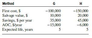 Elias wants to perform an after-tax evaluation of equivalent methods to electrostatically remove airborne particulate matter from clean rooms used to package liquid pharmaceutical products. Two alternatives are available, but others may be identified if these are not acceptable. Using the information shown, MACRS depreciation with n = 3 years, a 5-year study period, after-tax MARR = 7% per year, Te = 34%, and a spreadsheet, he obtained the results AWG = $ â 2176 and AWH = $3545. Any tax effects when the equipment is salvaged were neglected. Thus, with MACRS depreciation, method H is the better method. Use classical SL depreciation with n = 5 years to evaluate the same alternatives. Is the decision different from that reached using MACRS?